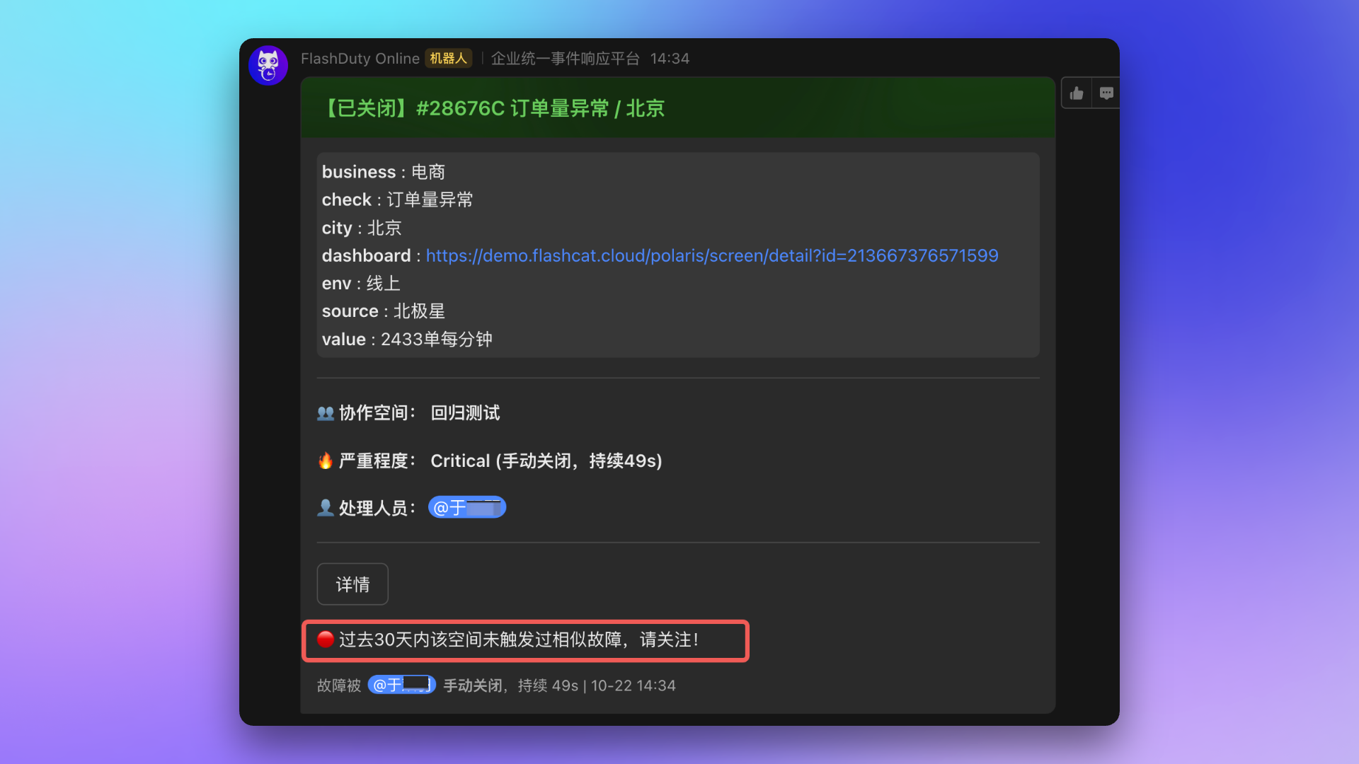 - 在故障详情页面,新奇故障将在最上方提供明显的 新奇 标识和解释