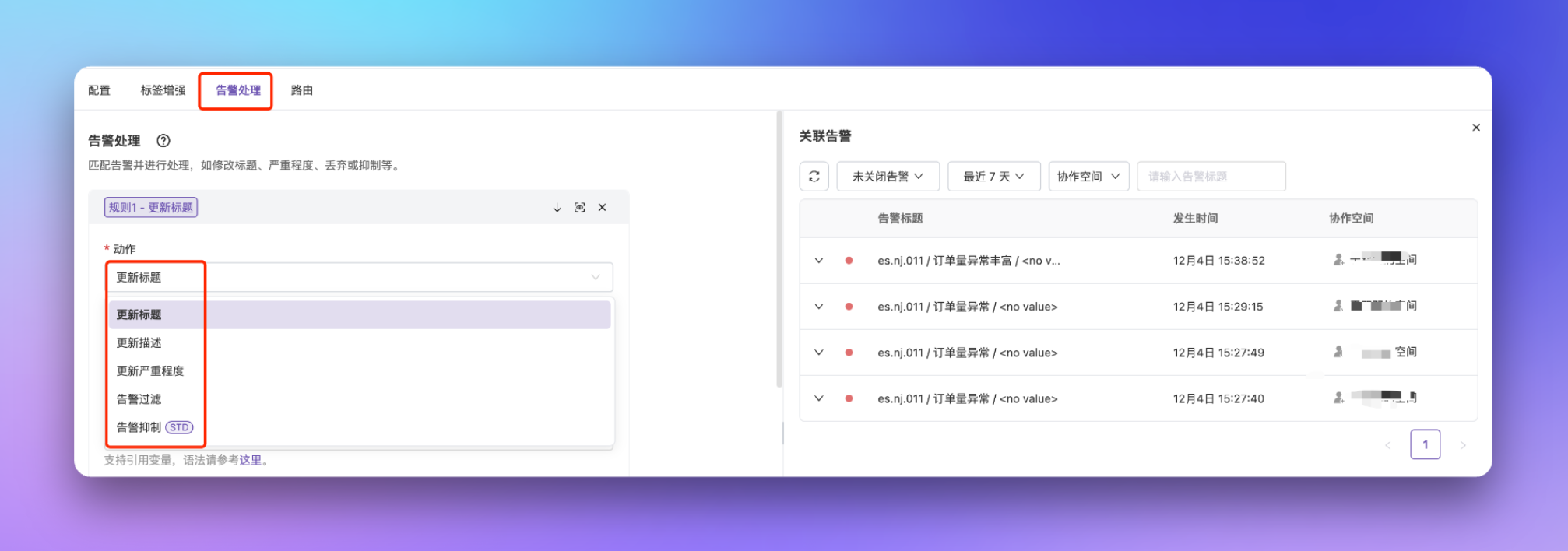 进入 集成中心 => 选择已创建的集成 => 告警处理 页签。